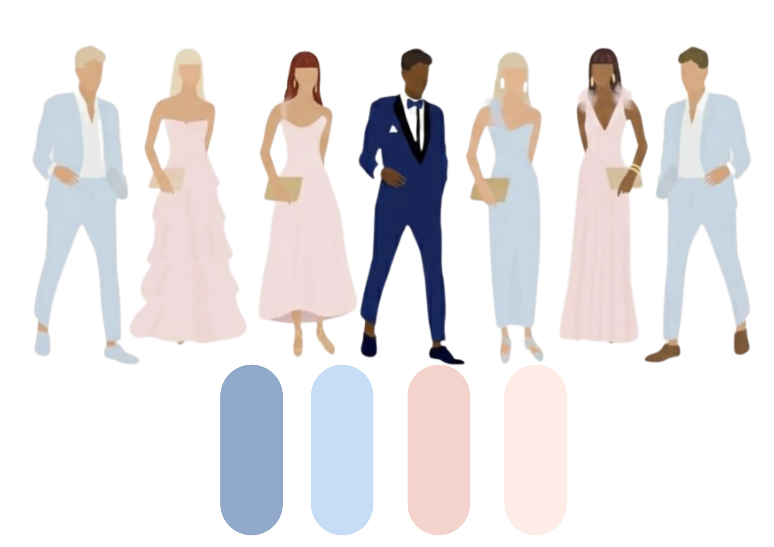a look that’s soft, refined, and beautifully understated. Please choose gentle shades from the color palette shared herein as baby blue, sky blue, blush pink, dusty mauve, soft rose gold or dusty blue, and avoid bold or neon tones.